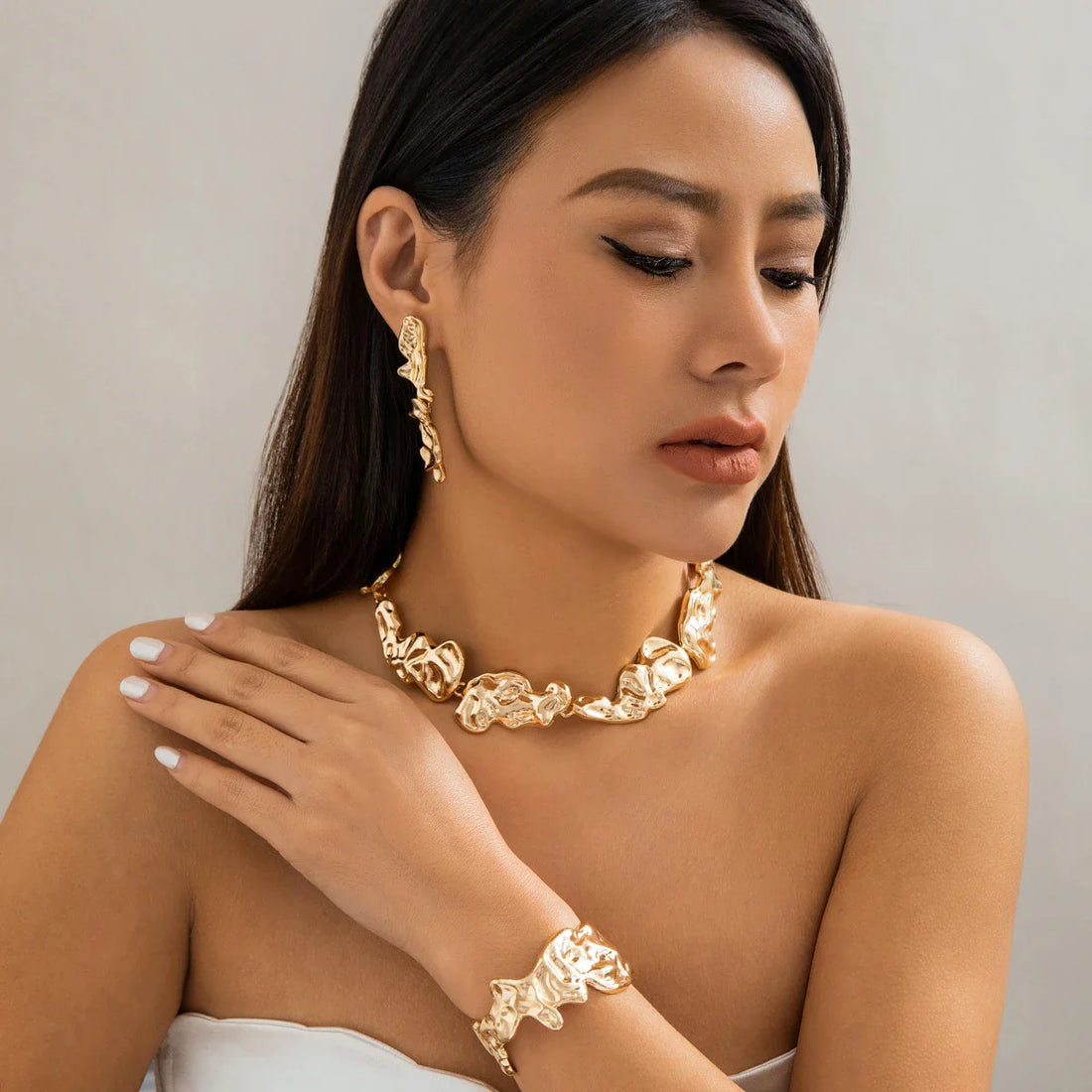 Conjunto Colar Brincos e Pulseira Irregular Dourada