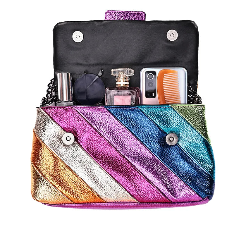 Eleve seu estilo com a Bolsa Colorida Listrada Prestige. Seu design sofisticado e detalhes dourados trazem um toque de glamour ao seu look. Perfeita para ocasiões especiais ou para se destacar no dia a dia. Aproveite essa oferta exclusiva e adquira já essa bolsa deslumbrante. Brilhe com confiança e destaque-se com muito luxo