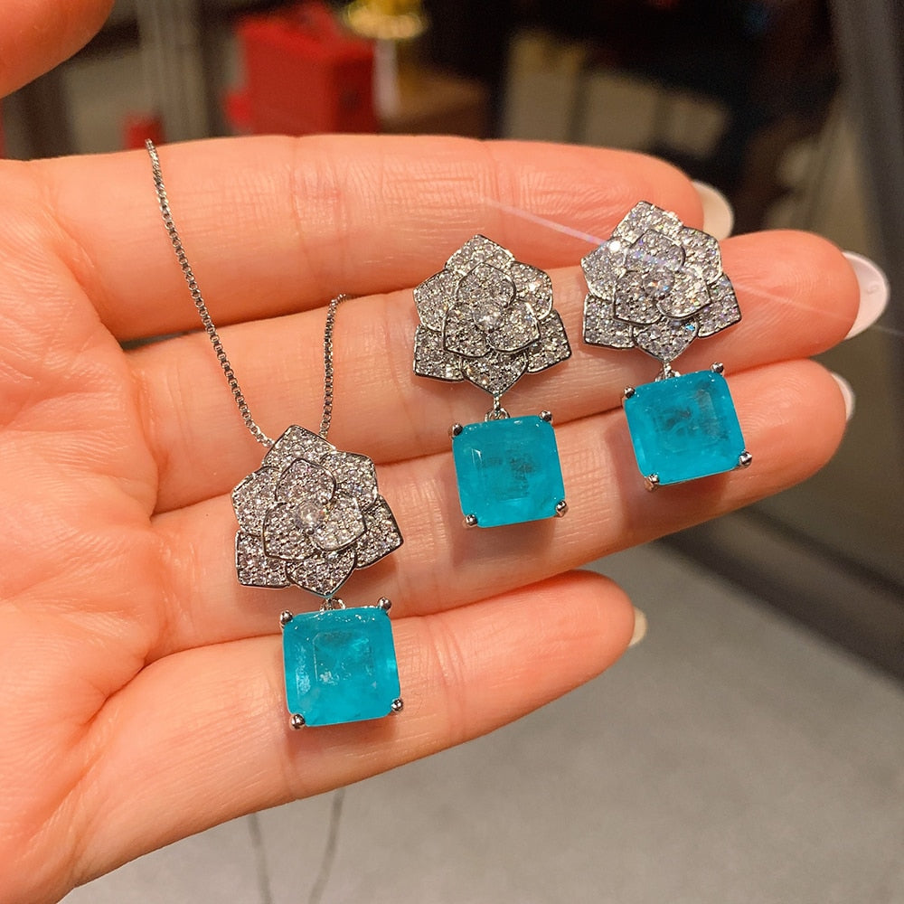 Conjunto Rosas Cravejadas com Pingente de Turmalina Paraíba